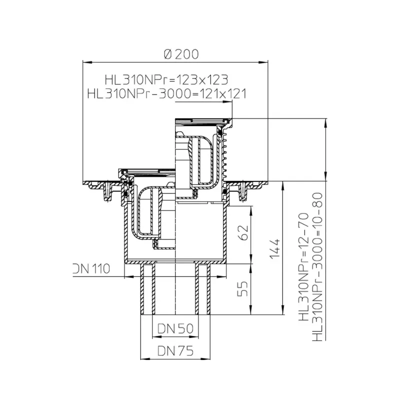 HL310NPR Padlólefolyó DN50/75/110 függőleges kimenettel, szigetelő karimával,"Primus" bűzzárral, 123x123mm/115x115mm
