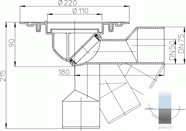 Balkon- és teraszlefolyó test DN50/75 elfordítható kimenettel, szigetelő karimával.