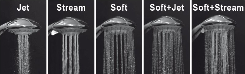 Az elegáns zuhanyfej öt fukncióval rendelkezik: JET, STREAM, SOFT, SOFT+JET és SOFT+STREAM.