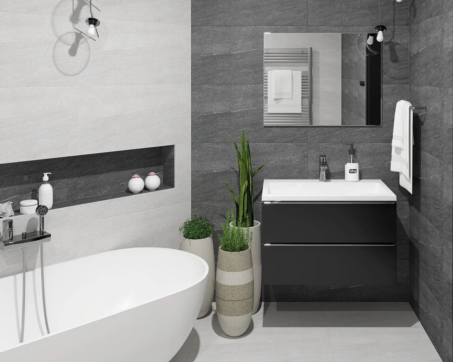 Kőhatású szürke matt modern stílusú,élcsiszolt kültéri és beltéri használatra egyaránt alkalmas.