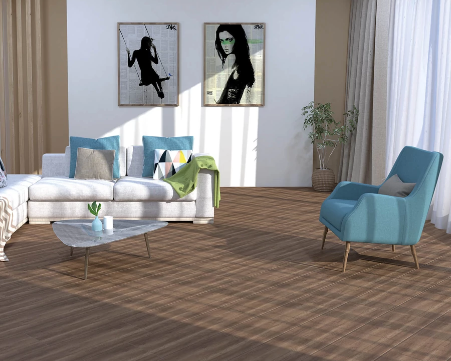Időtálló fahatású matt barna modern stílusú padlóburkolat.