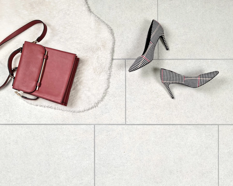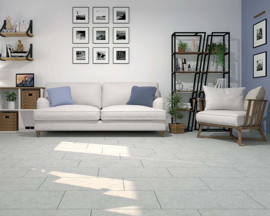 Kőhatású matt világosszürke klasszikus sílusú padlólap.