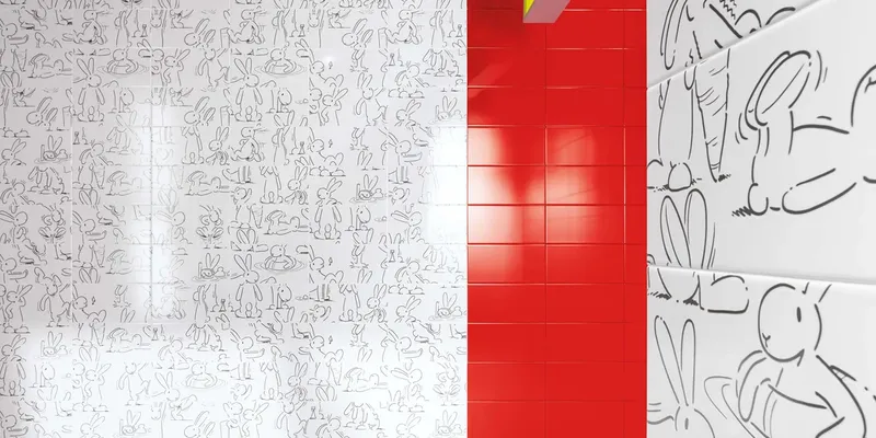 Piros fényes, modern stílusú fürdőszoba csempe.