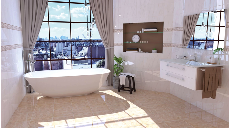 Fényes elefántcsont színű, klasszikus fürdőszoba csempe.