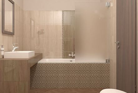Fényes bézs fahatású, klasszikus fürdőszoba csempe.
