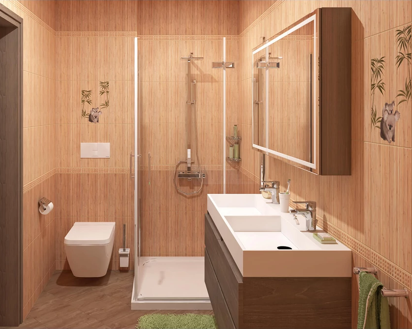 Matt bézs fahatású fürdőszoba csempe.
