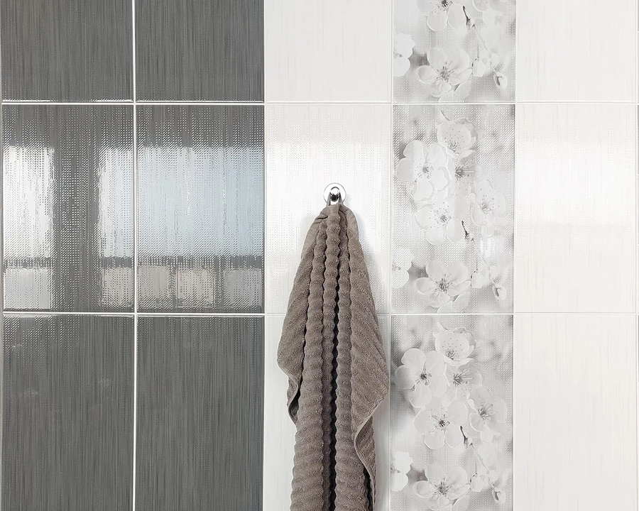 Fényes világosszürke, modern hatású fürdőszoba csempe.