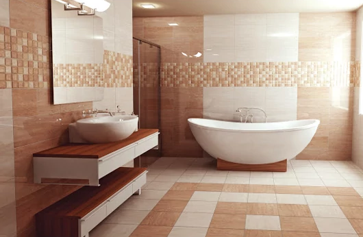 Fényes bézs márvány hatású fürdőszoba csempe.