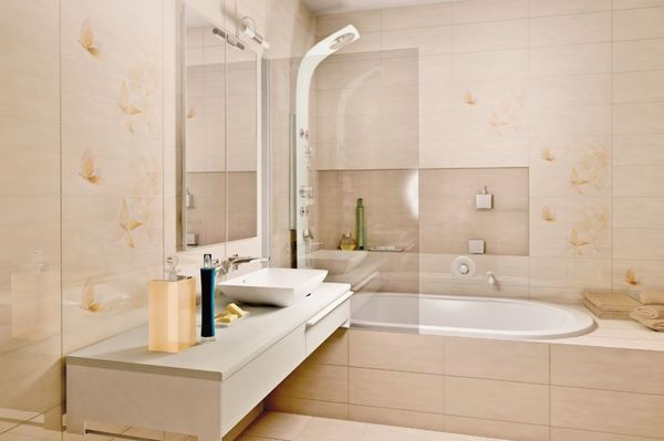 Fényes világos bézs klasszikus hatású fürdőszoba csempe.