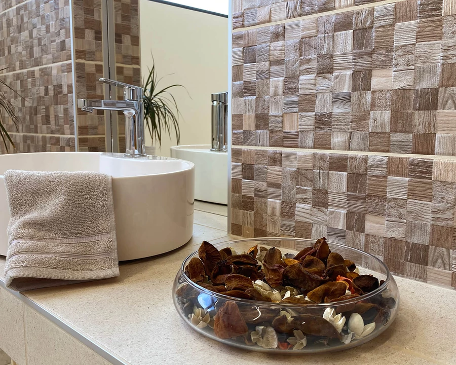 Stuktúrált, mozaik dekorcsempe kellemes natúr színvilágának köszönhetően