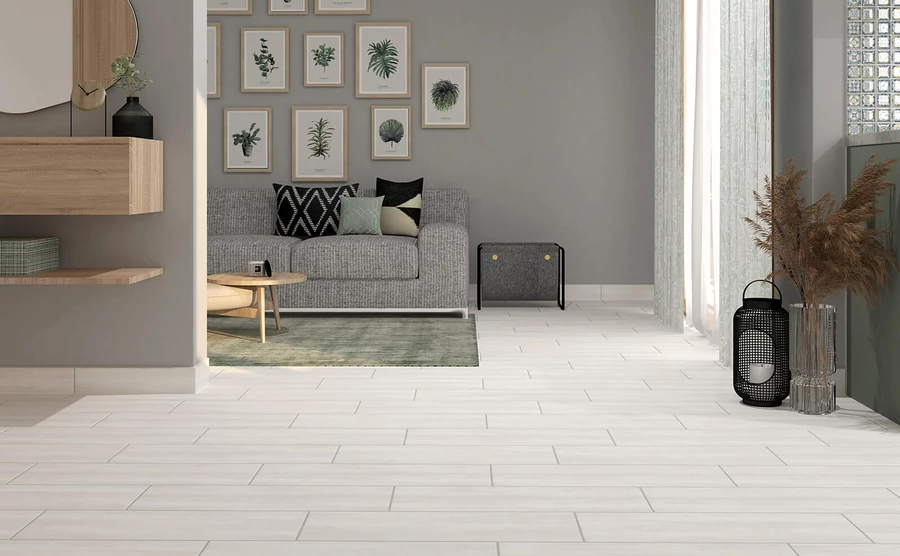 Időtálló fahatású matt fehér modern stílusú padlólap.