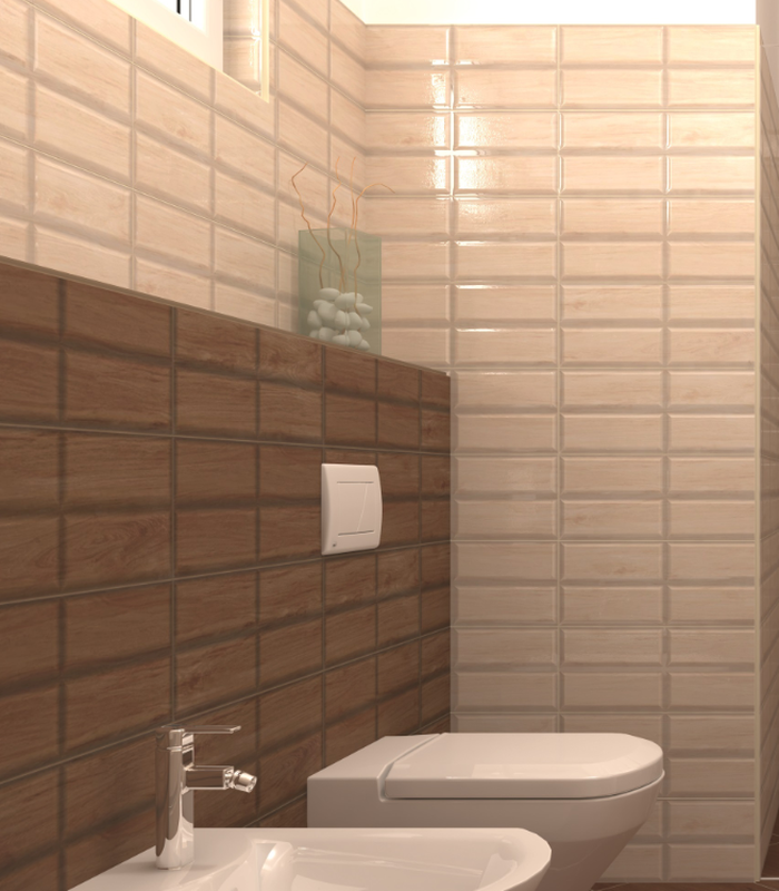 Fényes bézs fahatású, metro stílusú fürdőszoba, konyha csempe.