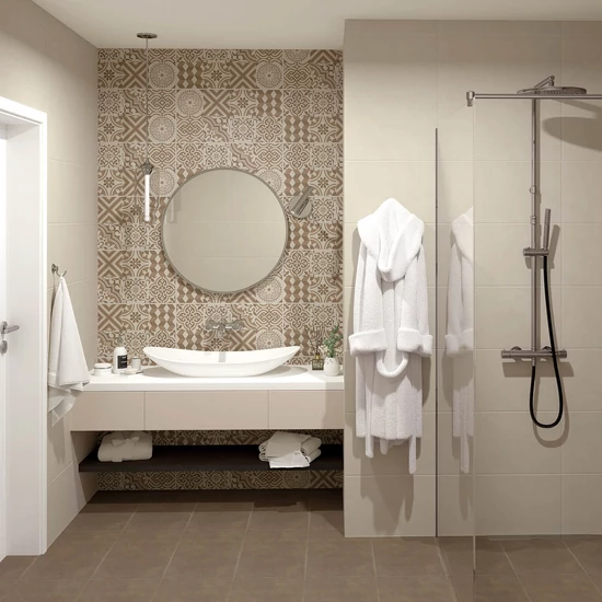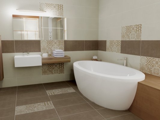 Hangulatos majolika mintás dekorlap szolidan feldobja a fürdőszobát.