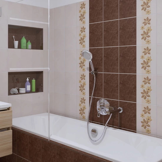 Matt, többszínű, márványhatású fürdőszoba csempe.
