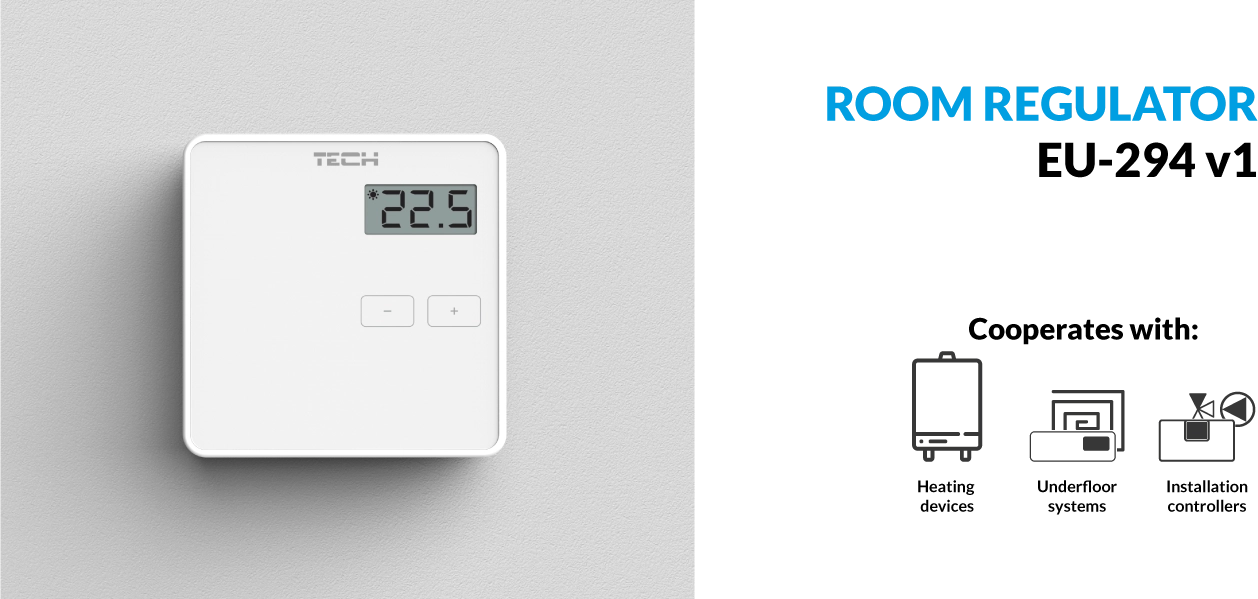 Az EU-294 típusú helyiségszabályozó egy fűtőberendezés vezérlésére szolgál (pl. Gáz, olaj vagy elektromos kazán vezérlője). Ezt a szabályozót úgy tervezték, hogy fenntartsa a lakásban beállított hőmérsékletet azzal, hogy jelet küld a fűtőberendezésnek (nyitó érintkező) a helyiség előmelegítéséhez szükséges hőmérsékletre vonatkozó információkkal.