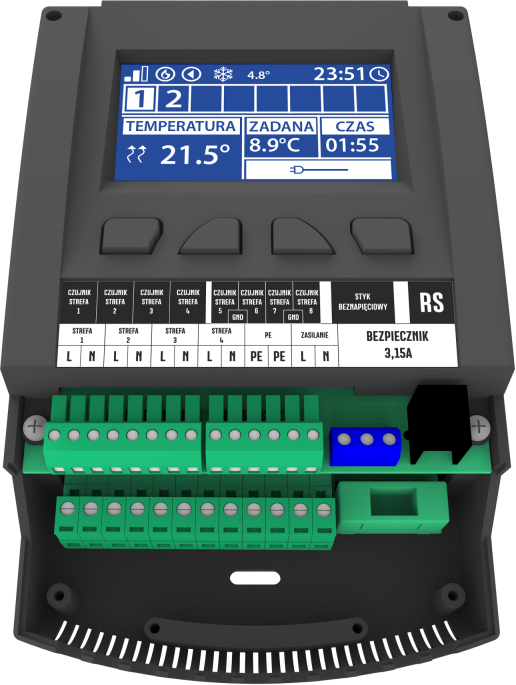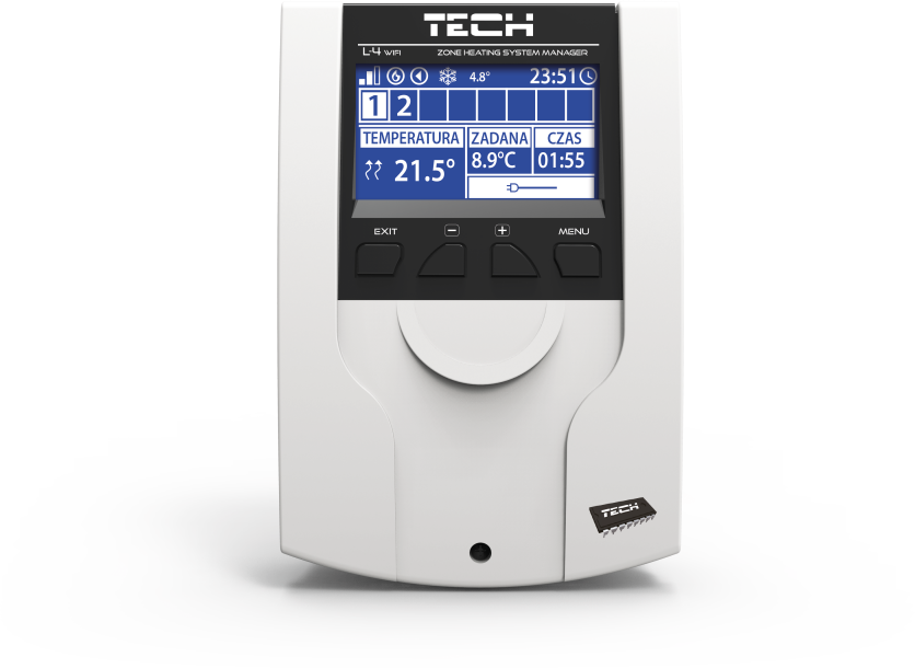 Az EU-L-4 WiFi kevert fűtési rendszerek vezérlője, amelyet a kazán és szelepmozgatók kezelésére terveztek, és szabályozzák a víz áramlását akár 8 KF zónában (max. 4 padlófűtési zóna, 4 vezeték nélkül vezérelt zóna).