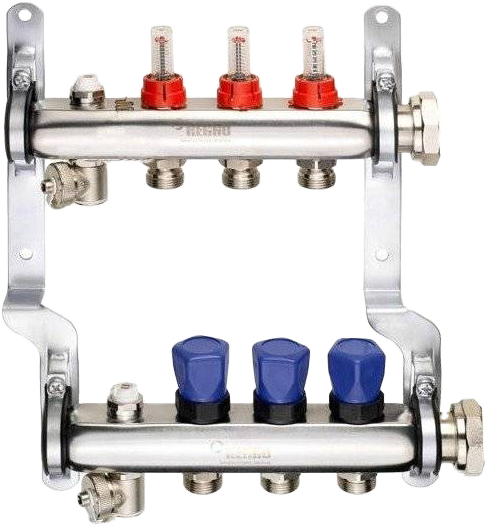 Visszatérő beépített termosztatikus szelepbetétekkel az egyes fűtő ill.hűtőkörök elzárásához,kék kézi elzáró,szelepek a REHAU MINI termoelektromos szelepfejekhez.