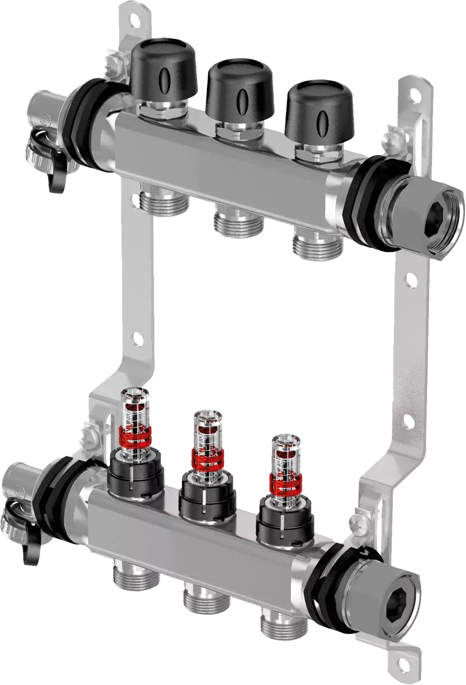 Az előremenő ágon térfogatáram mérővel, az egyszerű kézi beszabályozáshoz, míg a visszatérő ágon szelepes elzáróval,melyre Uponor Smart S 24V és 230V állásszaályzó szerelhető.