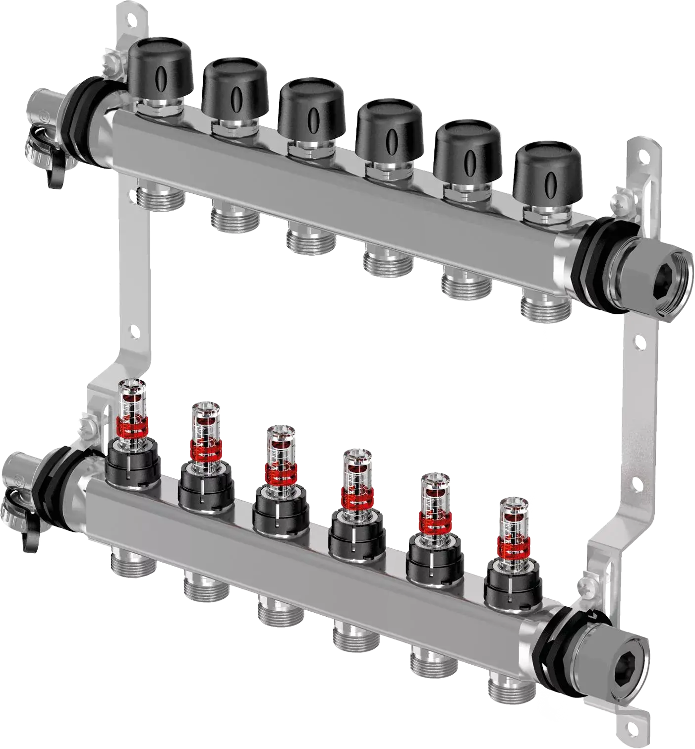 Rozsdamentes acélból készült osztó-gyűjtő padlófűtési célokra.Az előremenő ágon térfogatáram mérővel, az egyszerű kézi