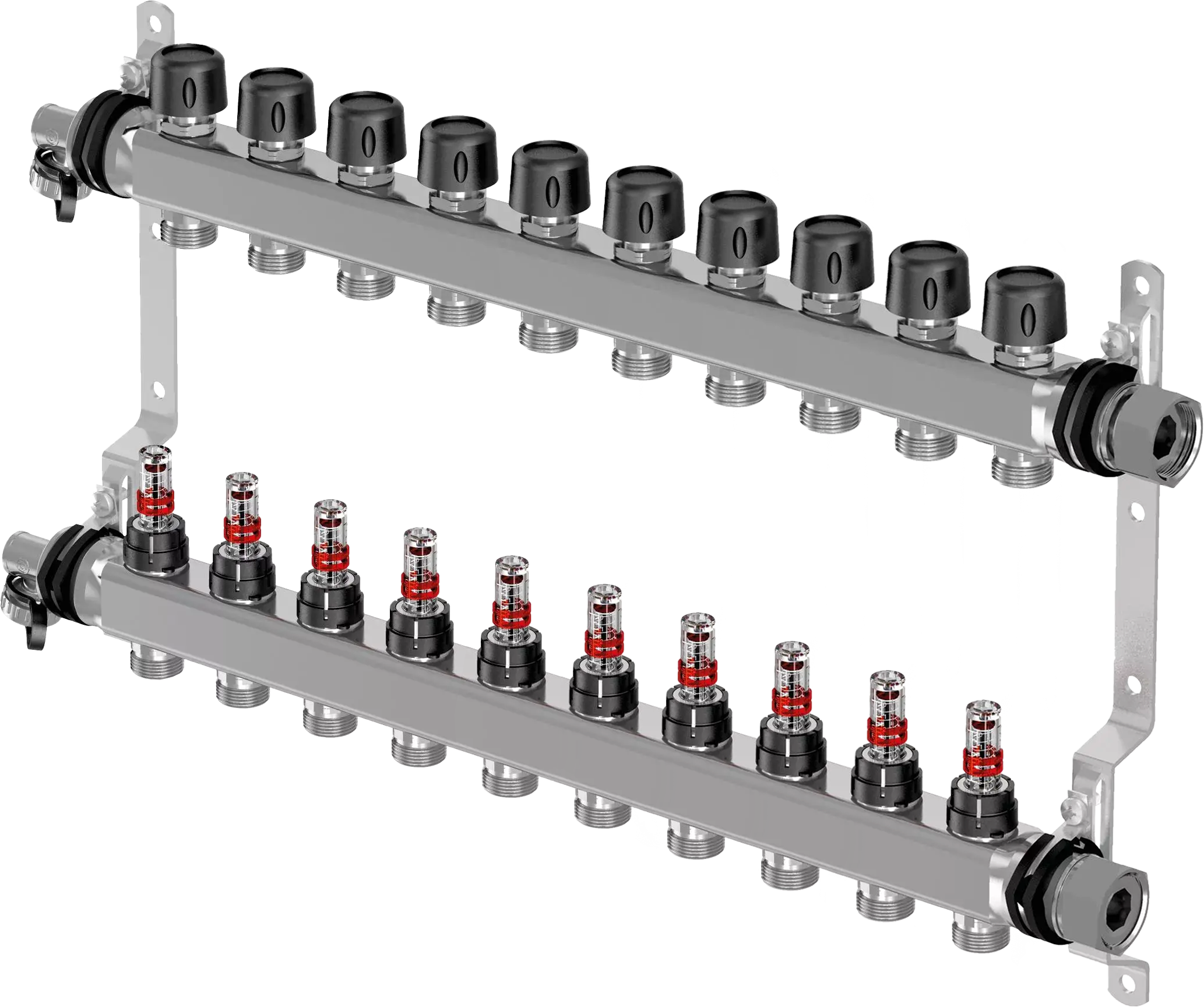 Rozsdamentes acélból készült osztó-gyűjtő padlófűtési célokra.Az előremenő ágon térfogatáram mérővel, az egyszerű kézi