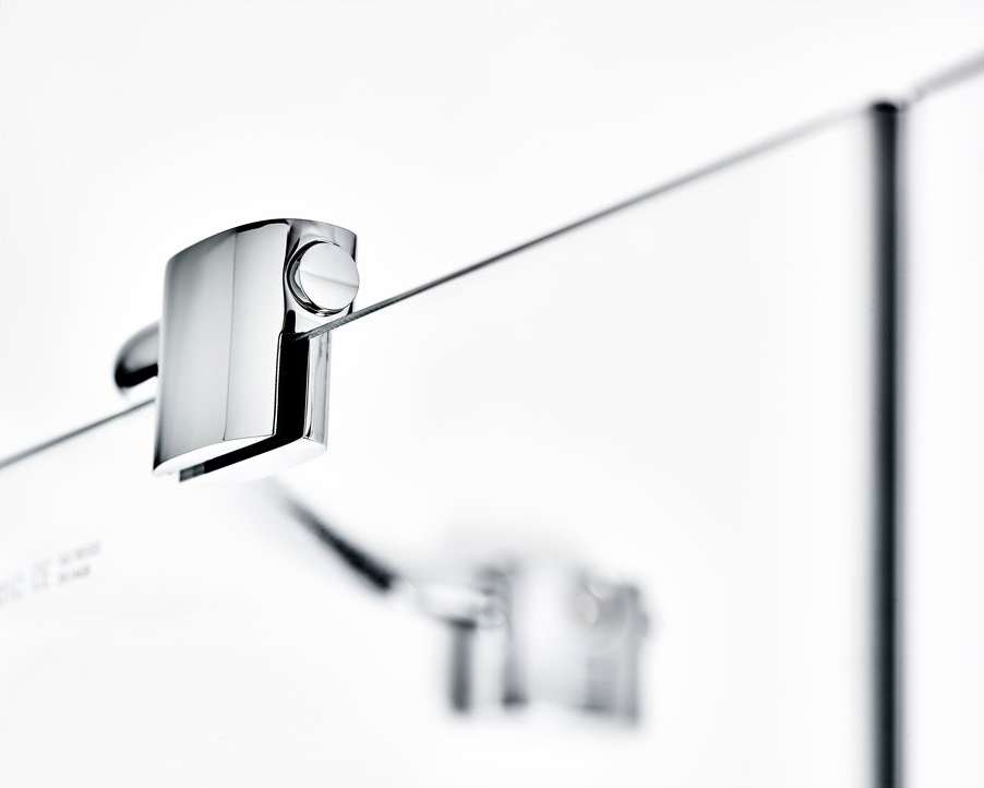 A csillogó fém alkatrészekkel lágyan hangsúlyozott üveg letisztult eleganciája kiemeli a zuhanykabin könnyed, szellős benyomását.