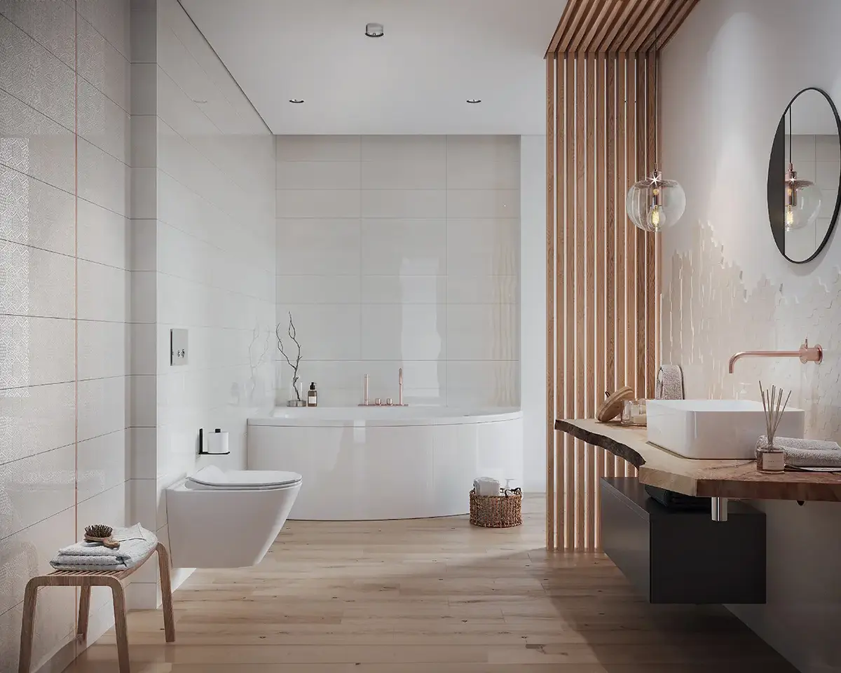 A fényes falicsempék elegánsak, nagyvonalúak, tiszta hatást keltenek.