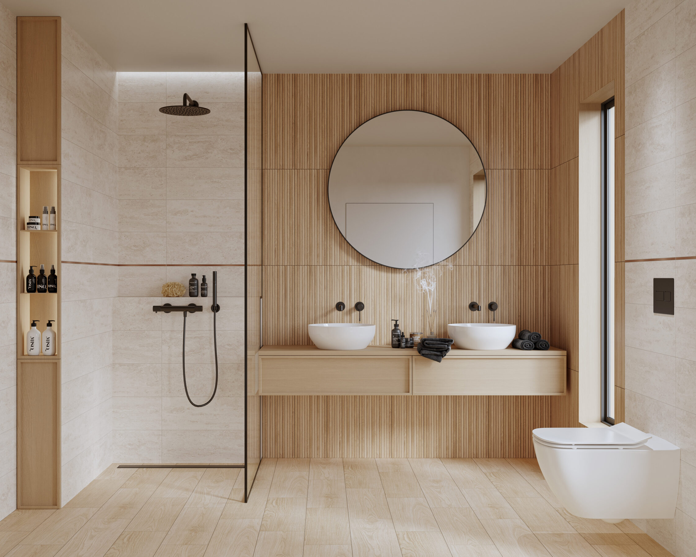 A “Silky Travertin Cream” csempe fényes befejezése nemcsak szép, de praktikus is,