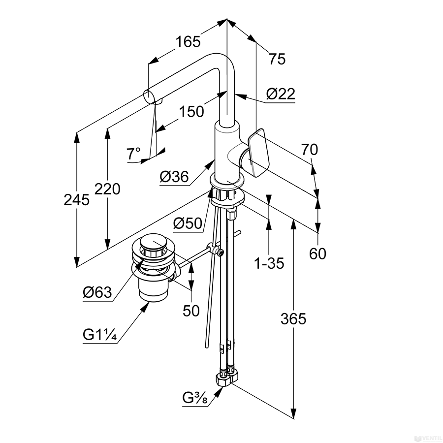 image-1219aeb7.png Alca A390 Click-Clack mosdó leeresztőszelep 5/4", túlfolyóval, fémből, nagy dugóval