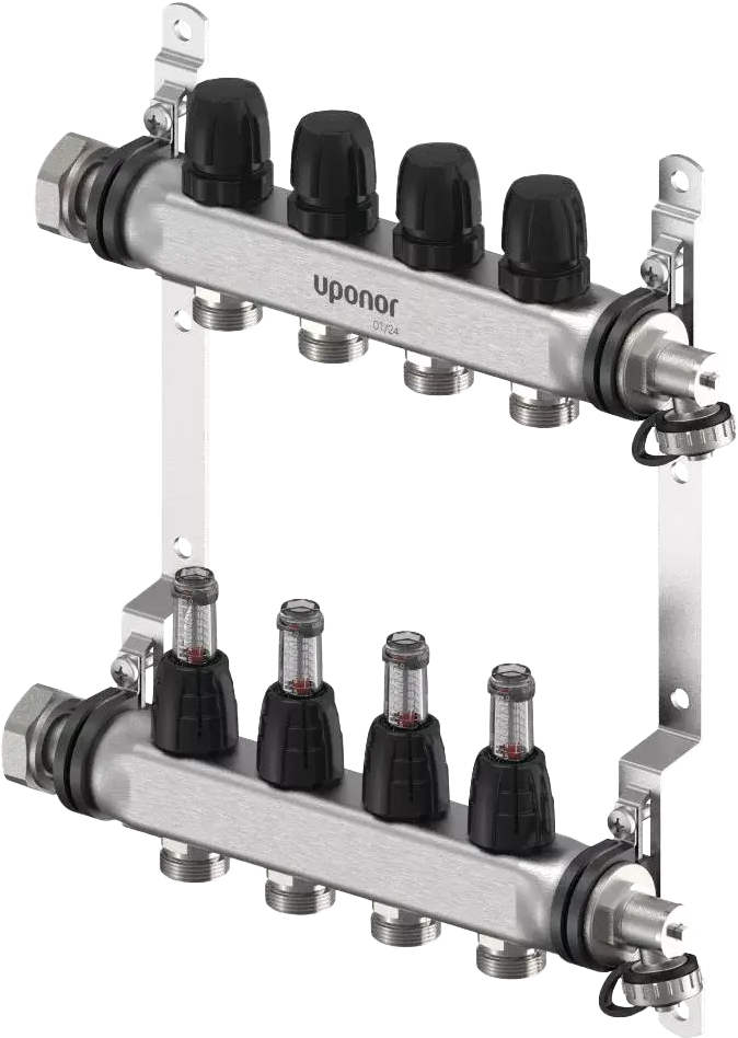 Áramlásmérős osztó-gyűjtő rozsdamentes acélból. Jellemzően padlófűtési célokra alkalmas fűtési szerelvény. A készlet tartalmazza a tartót, töltő-ürítőket és elzáró kupakokat.