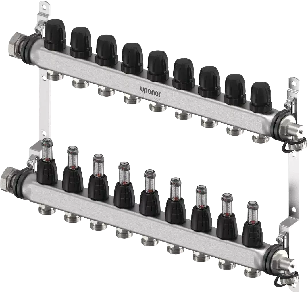 Áramlásmérős osztó-gyűjtő rozsdamentes acélból. Jellemzően padlófűtési célokra alkalmas fűtési szerelvény. A készlet tartalmazza a tartót, töltő-ürítőket és elzáró kupakokat.