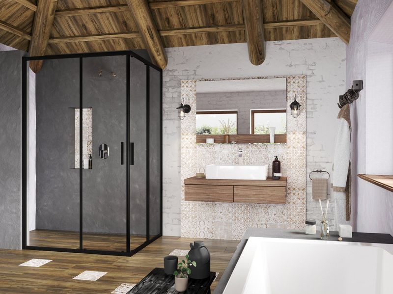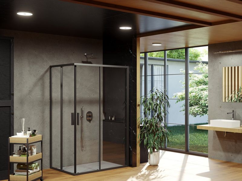 Fél oldal Blix Slim sarokzuhanykabin kialakításához, fekete kerettel, átlátszó biztonsági üveggel és RAVAK AntiCalc® vízlepergető réteggel. Tolóajtós rendszer. A termék egy fix és egy mozgó részből áll.A zuhanykabin a fürdőszoba lecsempézett sarkába RAVAK Angela, Perseus, Perseus Pro, Perseus Pro Flat, Perseus Pro Chrome, Gigant Pro, Gigant Pro Flat, Gigant Pro Chrome zuhanytálcákra vagy közvetlenül a zuhanyfolyókával vagy padlóösszefolyóval rendelkező lecsempézett padlóra telepíthető.