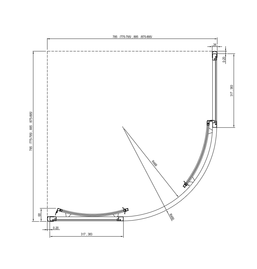A zuhanykabin a fürdőszoba lecsempézett sarkába RAVAK Ronda, Elipso, Elipso Pro, Elipso Pro Flat, Elipso Pro Chrome zuhanytálcákra vagy közvetlenül a zuhanyfolyókával vagy padlóösszefolyóval rendelkező lecsempézett padlóra telepíthető.