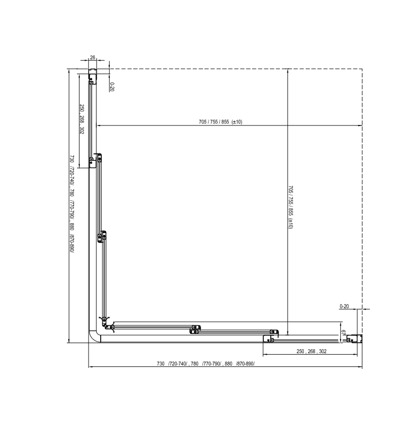 Egy teljes zuhanykabin kialakításához két darab ASRV3 tolóajtó szükséges, a sarokelem minden csomagolás tartozéka. Mindkét rész különböző méretének kombinációjával négyzet vagy téglalap alapú zuhanykabint alakíthatunk ki (pl.: 75 x 90 cm, 80 x 90 cm és így tovább).