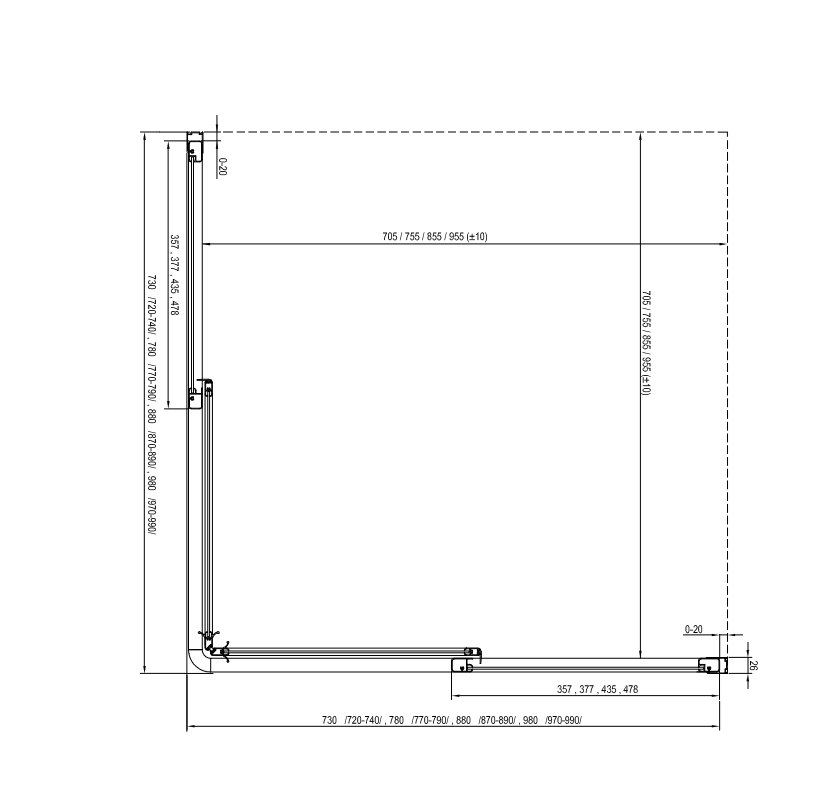 Egy teljes zuhanykabin kialakításához két darab SRV2-S tolóajtó szükséges. Mindkét rész különböző méretének kombinációjával négyzet vagy téglalap alapú zuhanykabint alakíthatunk ki (pl.: 75 x 90 cm, 90 x 90 cm, 80 x 100 cm és így tovább).