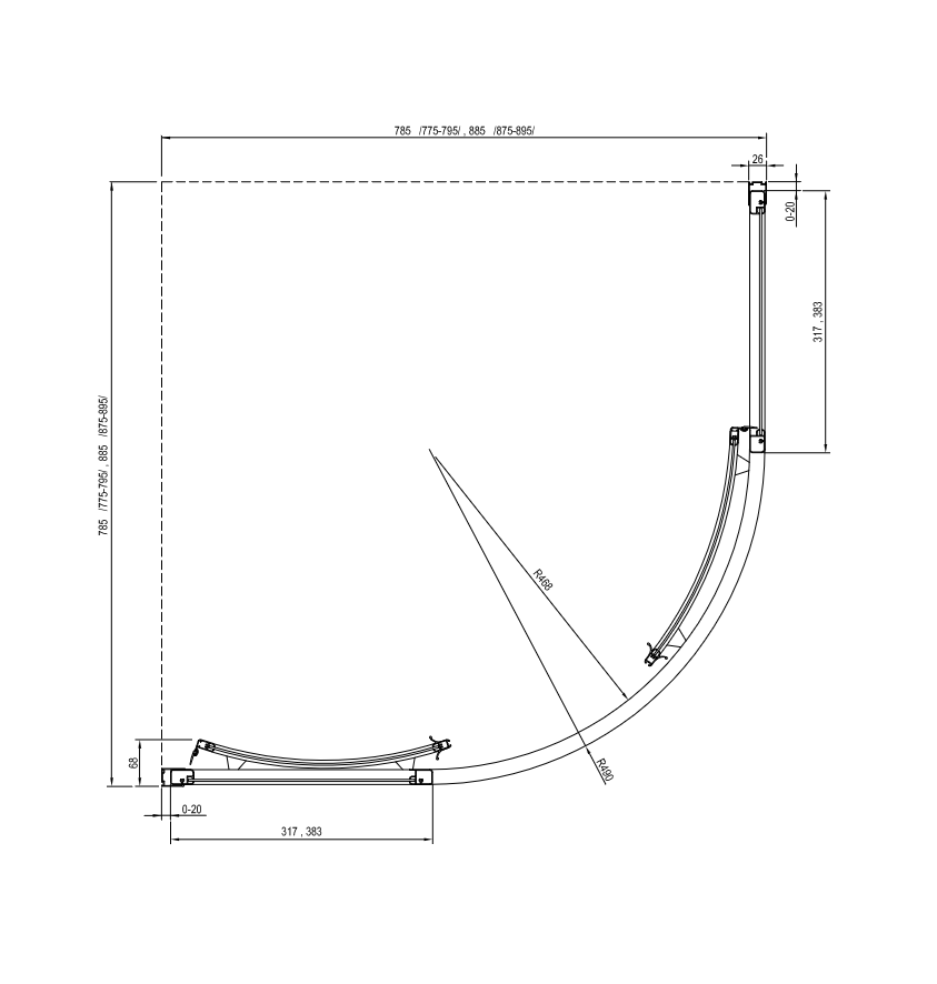 A zuhanykabin a fürdőszoba lecsempézett sarkába RAVAK Ronda, Elipso, Elipso Pro, Elipso Pro Flat, Elipso Pro Chrome zuhanytálcákra vagy közvetlenül a zuhanyfolyókával vagy padlóösszefolyóval rendelkező lecsempézett padlóra telepíthető.