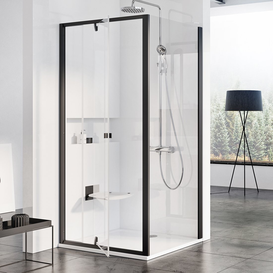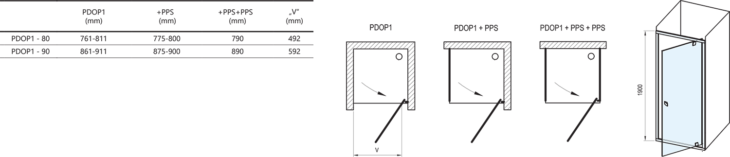 zuhanyfolyókával, padlóösszefolyóval közvetlenül a padlóra ültethető. Két PPS fix fal kombinációjával „U” alakú zuhanyzó hozható létre.
