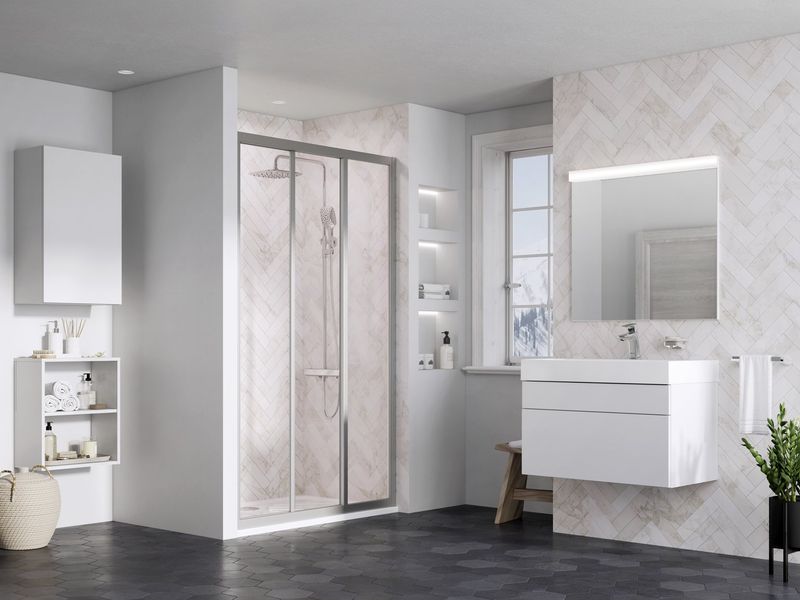 Supernova háromrészes zuhanyajtó, szatén színben, transparent üveg betétlemezzel.
