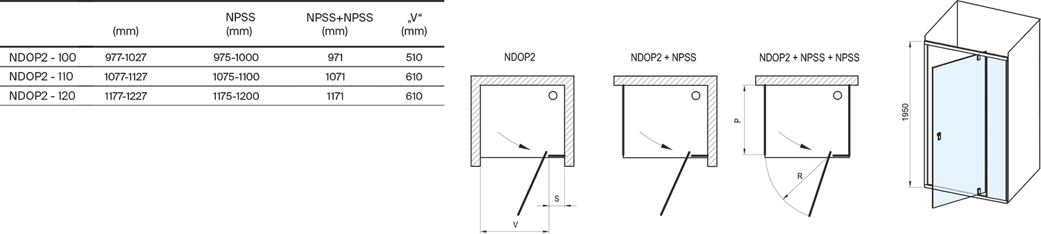 Két NPSS fix oldalfallal kombinálva “U” alakú zuhanykabint alakíthatunk ki. A NNPS toldóprofil használatával 20 mm-rel is szélesítheti zuhanykabinját, ezért tökéletesen alkalmazkodik az esetleges építési egyenlőtlenségekhez akár 4 cm-rel mindegyik oldalon.