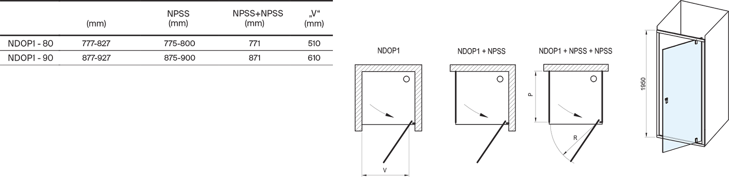 A termék egy kifelé nyíló részből áll, amely a zuhanyajtót képezi. A termék 180°-os megfordításával választhatunk a balos vagy jobbos változat között.