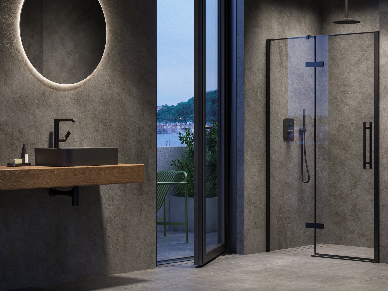 Kétrészes COOL! zuhanyajtó fényes króm vagy fekete színben. Átlátszó üveg RAVAK Anticalc® védőbevonattal. Zsanéros nyitórendszer. Elfordítható termék a jobb és bal oldali változathoz. Ideális megoldás a 100-120 cm széles zuhanyzóhely kialakításához.
