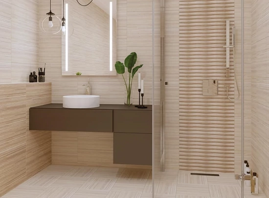 Bézses-barnás textúra feldobja a felburkolt enteriőrt.