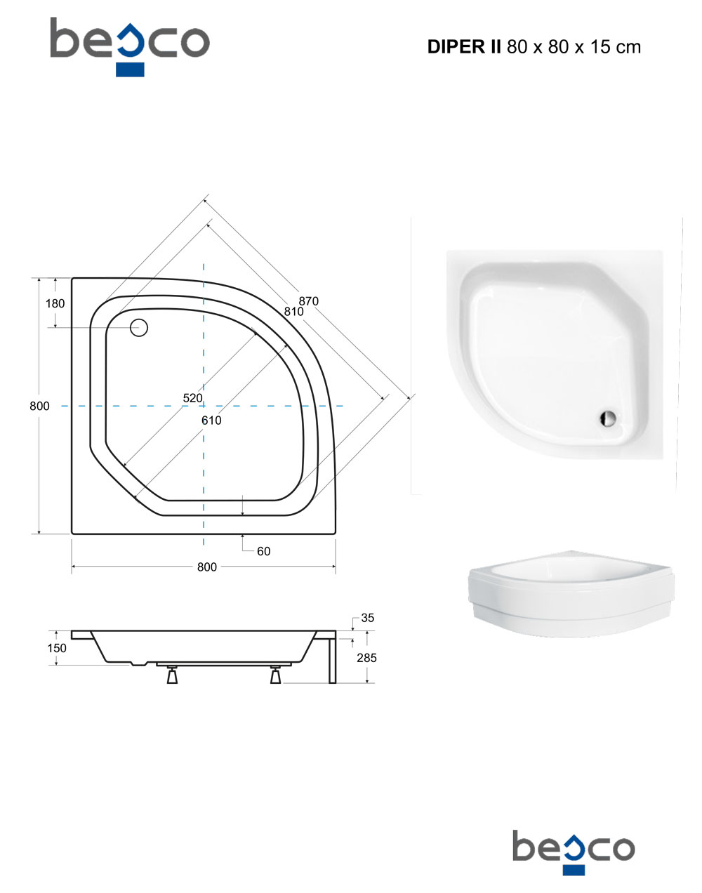 Besco Diper II 80x80 cm-es magasított negyedköríves zuhanytálca