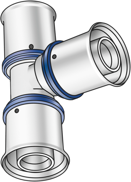 Préselhető T-idom, két végén azonos vagy szűkített, sárgarézből, pórusmentes fémbevonattal, O-gyűrűs támasztóhüvelyekkel és nemesacél préshüvelyekkel.