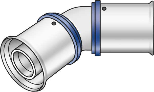 45°-os préselhető könyökidom irányváltoztatáshoz minimális sugárral, pórusmentes fémbevonattal ellátott sárgarézből, O-gyűrűs támasztóhüvelyekkel és nemesacél préshüvelyekkel.