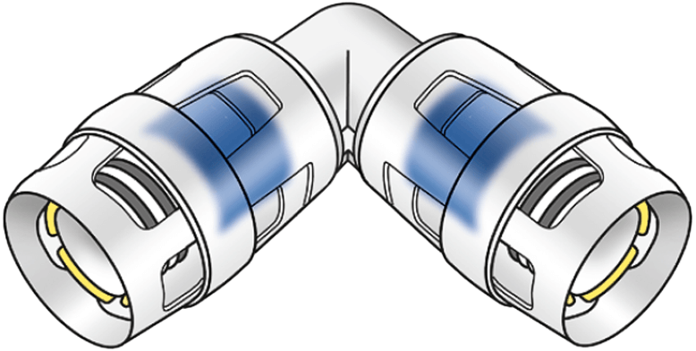 Gyorscsatlakozós 90°-os könyök, irányváltoztatáshoz minimális sugárral, cinkkiválás-mentes sárgarézből (DZR), betoláskor kattanó hangot adó, átlátszó poliamid gyorscsatlakozós hüvellyel, valamint haptikus és optikai betolásjelzővel, O-gyűrűkkel, kihúzásgátlókkal és védőgyűrűvel a biztos betolásért.