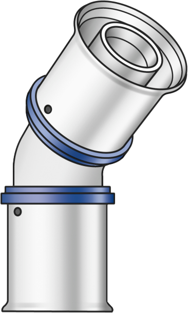 45°-os préselhető könyökidom irányváltoztatáshoz minimális sugárral, pórusmentes fémbevonattal ellátott sárgarézből, O-gyűrűs támasztóhüvelyekkel és nemesacél préshüvelyekkel.