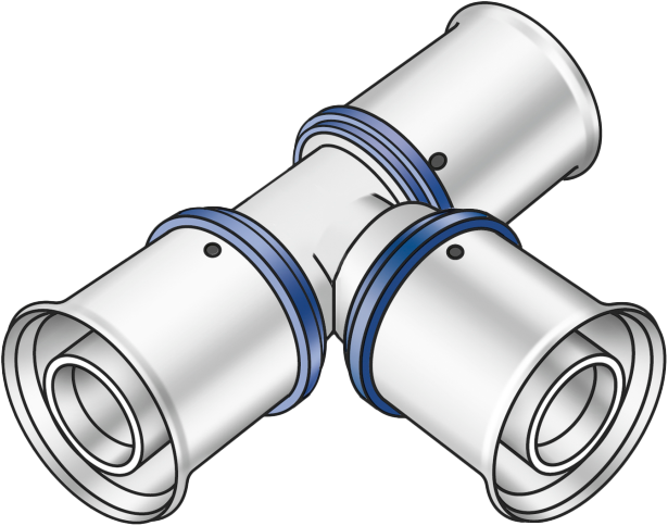 Préselhető T-idom, két végén azonos vagy szűkített, sárgarézből, pórusmentes fémbevonattal, O-gyűrűs támasztóhüvelyekkel és nemesacél préshüvelyekkel.