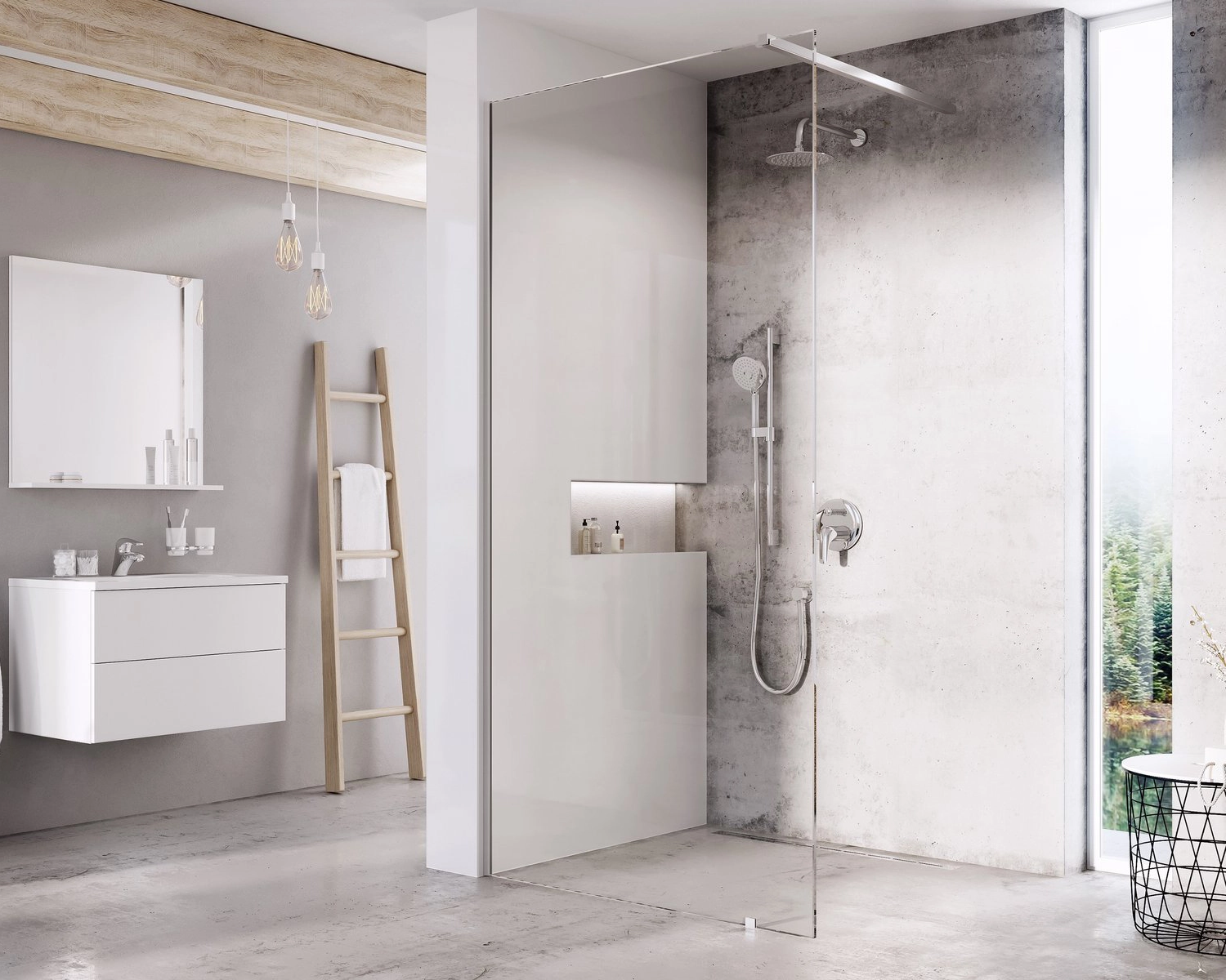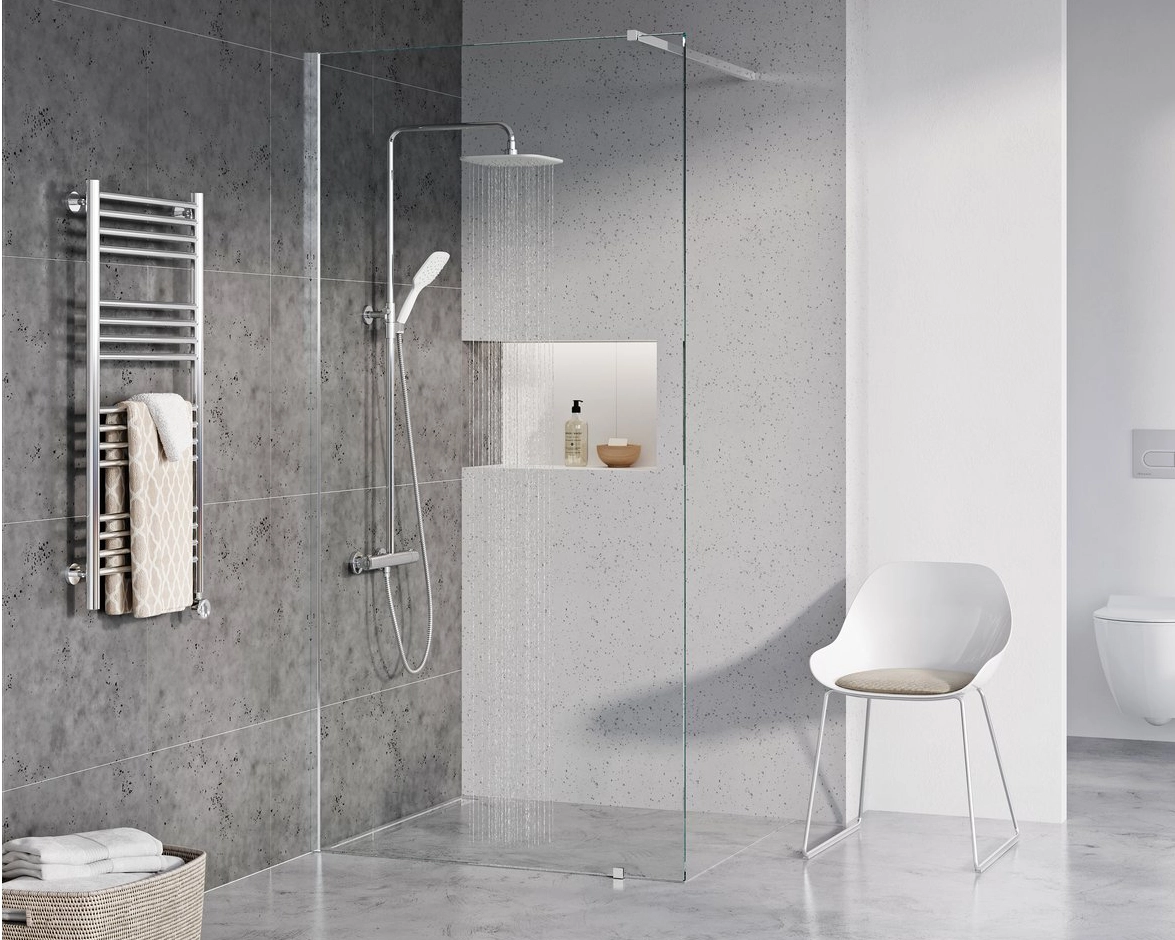 A termék stabilitását egy fém merevítő biztosítja, amely meghatározza a belépés szélességét. A Walk-In Wall zuhanykabin fényes krómozott fém alkatrészekkel rendelkezik. Javasoljuk burkolt fürdőszoba sarokba történő telepítését, közvetlenül a padlóra, beépített padlóösszefolyóval vagy zuhanyfolyókával. A zuhanykabin univerzális, a beszereléskor választható jobb vagy bal oldali belépés. A csomag tartalmaz egy fix üvegfalat beállító profilt, fényes króm kivitelben.