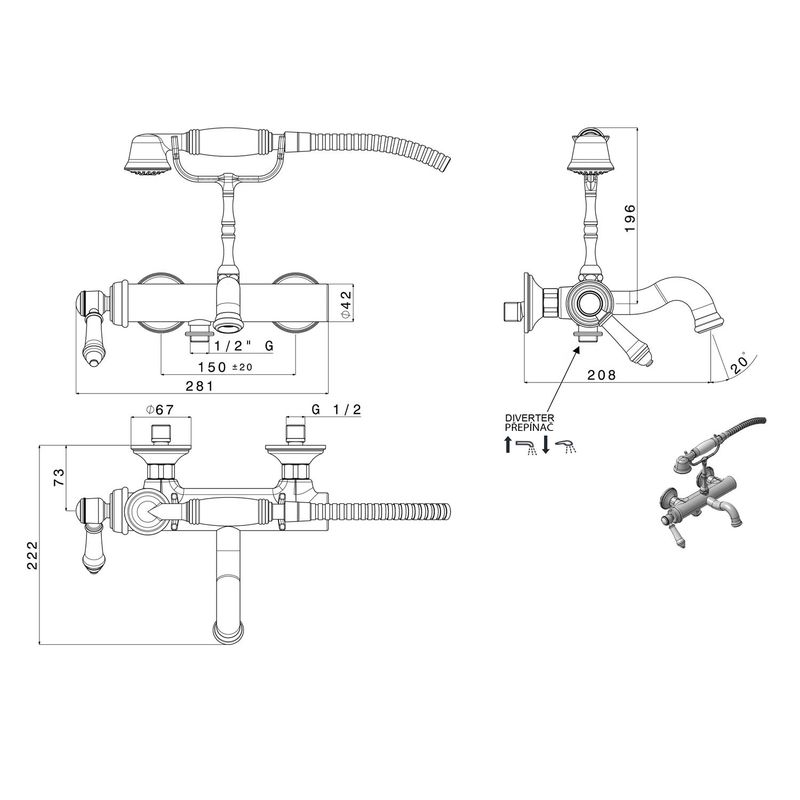 Sapho Vienna fali kádtöltő csaptelep zuhanyszettel, króm VO010
