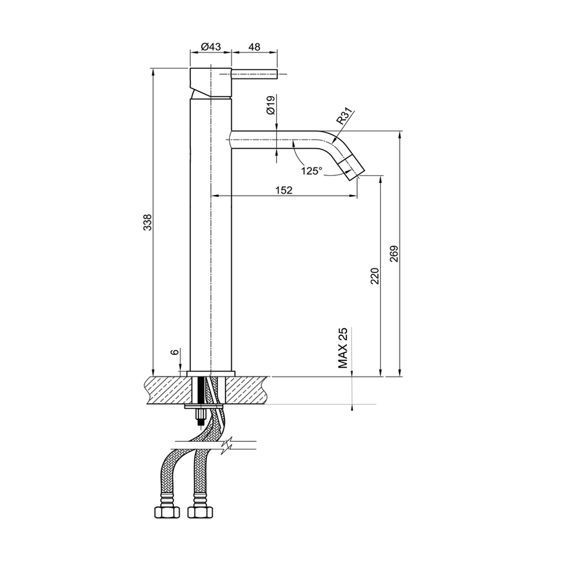 Sapho Minimal magasított mosdó csaptelep 338mm,leeresztő nélkül,inox MI202